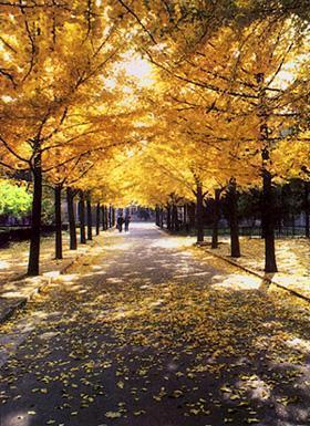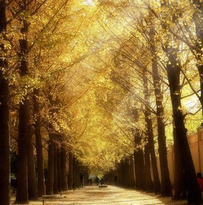 看到北大银杏,感觉总有些不同,因为地处北大校园,这里的银杏也沾染了些许的书卷味道。一旦叶子开始变黄,就有无数少男少女在树前留影,青春与银杏树叶一样灿烂。未名湖边上也有稀疏的银杏树,只是幼树居多,需要耐心从北到南转上一圈。金黄叶子映衬着著名的“一塔湖图”以及湖边看书的学子,或者私语的恋人,真是比画片更像画片。如果再往深处走,生物楼与第一教学楼之间也有小片银杏林,因为人少,所以安静,是聊天和拍照的好地方,不过最应景的,应该是什么都不说,在夕阳下的金黄中深情对视。