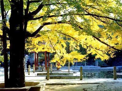 北京的寺庙里,到八大处公园也是秋季赏银杏很不错的选择。八大处公园的银杏树主要分布在寺庙内,大多为百年以上的古树,特别是大悲寺内的两株古银杏树,树龄在800年以上,10月下旬,黄叶纷落,满地碎金。灵光寺内银杏树正枝繁叶茂,观音殿前、佛牙舍利塔前的银杏树,十月下旬为最佳观赏期。