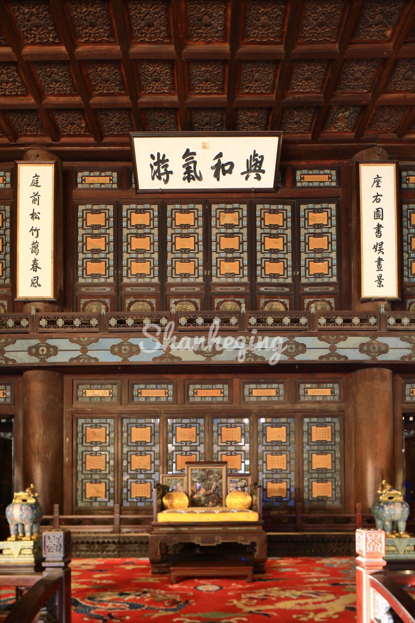 “乐寿堂”名出自孔子“仁者乐山,智者乐水,智者乐,仁者寿”,是乾隆皇帝预备将此处作为退位后的寝宫。屏风宝座上悬挂着“与和气游”匾,两侧对联曰:“座右图书娱画景,庭前松竹霭春风。”
