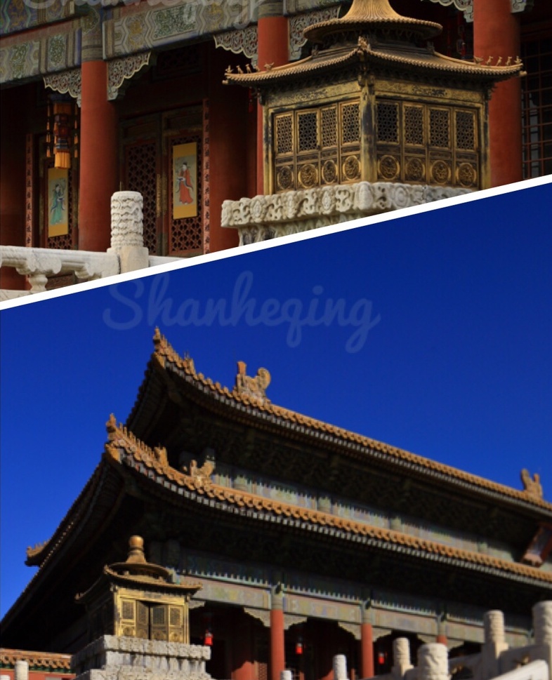 乾清宫月台两侧仿木构建筑的铜镀金小殿,始建于顺治十三年(1656年)。西侧社稷金殿供社稷神,东侧江山金殿供江山神。两座亭子统称社稷江山金殿,寓意励精图治,江山永固。