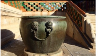 故宫中安放大小铜缸、铁缸三百多口,其中清代鎏金铜缸十八口,陈列在太和殿、保和殿和乾清门两侧。