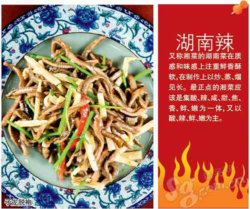 曾被毛主席夸赞“这是地道的家乡口味”的曲园酒楼创建于清光绪年间,这里的传统菜有腊味合蒸、东安子鸡、子龙脱袍、奶汤蹄筋、发丝百叶、汤泡肚尖等。子龙脱袍以鳝鱼为主料,新鲜的鳝鱼才能顺利地被脱皮,而外形就像古代武将脱袍,所以取名为“子龙脱袍”。而酸辣肚尖是非常开胃的菜,把肚尖上浆炸,然后混合泡菜、冬笋和香菇煸炒,色泽银红,酸辣嫩脆。