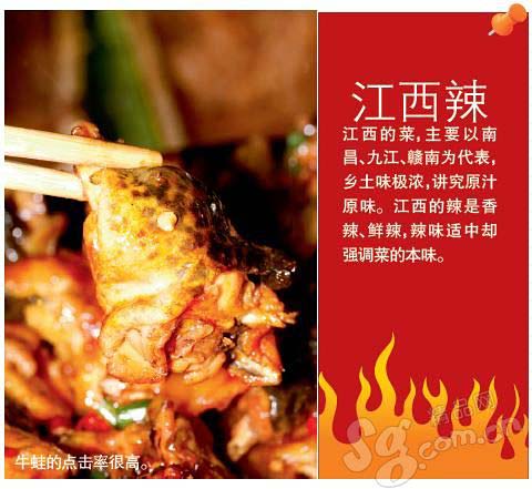 在大多数北京人的心里,江西就意味着井冈山、笋和各种小炒。毛笋或小笋配腊肉或鲜肉,制法简单,是道好菜。泥鳅蒸豆腐是江西特色,样子有点像黄蓉给老叫化做的“廿四桥明月夜”。腊月里当地人会制作不少腊味。江西人也喝汤,不过那里的人都是早上喝汤,南昌有不少专喝汤的汤店,老五汤店是当地人推荐的特色店。北京西江美食坊餐厅不大,菜品以赣菜为主,特别有江西地方特色。在这里可以吃到江西特产余干荷包辣椒,还有江西各大辣椒产地产的隔年自然风干的干辣椒。