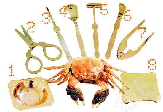 1.剪掉大闸蟹的8只脚,包括两只大钳,放凉后其中的肉会自动与蟹壳分开,很容易被捅出甚至是被吸出,因此要留待最后来吃。