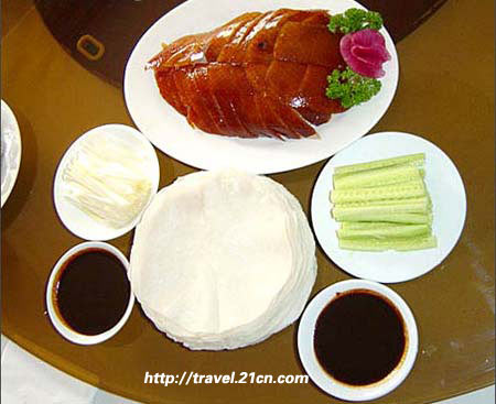 北京保留鸭皮沾白糖的烤鸭店已经不多了,在这里细细地品着大宅门里太太小姐们的吃法,放眼望去却是豫王府的青瓦飞檐和枯藤老树,恍惚间品出了不寻常的味道。一边是现代,一边是历史;一边是流动,一边是凝固。交错中又听到了厨师长京腔十足的问候,真的是在古老的北京品着北京烤鸭。