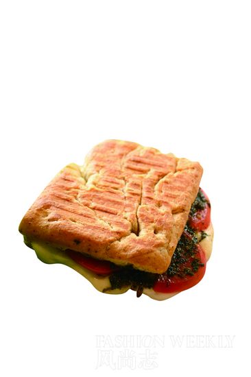 该款三明治的灵魂,由著名的新鲜奶酪马祖里拉构成。马祖里拉奶酪是少有的新鲜奶酪,保质期通常只有2~3天,一般用于Pizza的制作。为了保持其风味,常被泡在水中。在这款三明治中,直接取用,放置在面包片上。