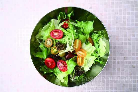 芝麻菜是沙拉中最贵的一种,入口略有苦感,但之后便是清香,原产欧洲南部。再铺上一层番茄,也可根据个人喜好,换成不同的新鲜蔬菜。