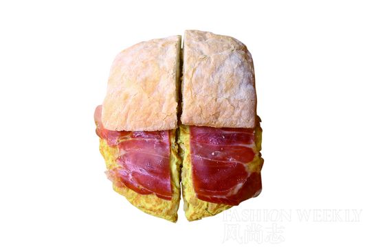 ①将卡巴塔面包现场烘烤后,切片;②制作牛柳、烤红椒、鸡蛋土豆饼等,并将西班牙火腿切片;③将不同的食材加入面包外壳里,获得不同的三明治外观和口感。