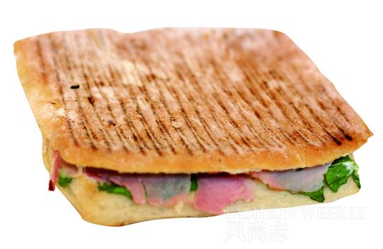 意式三明治被归类为热三明治,它用一种被称为grill的煎烤机烤制而成,面包上会有一道道烤出的焦印。标准的意式三明治用的是ciabatta面包,香脆可口,非常美味,意大利人习惯在下午来上一份。