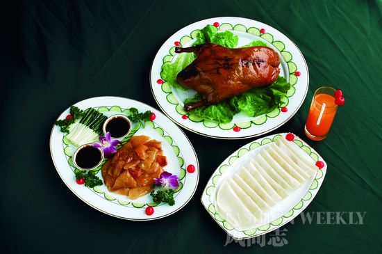 吃法:用筷子挑一点甜面酱,抹在荷叶饼上,放几片烤鸭盖在上面,再放上几根葱条、黄瓜条或萝卜条,将荷叶饼卷起,好吃无比。