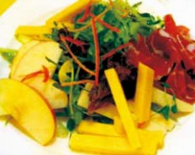 意式火腿配芝士苹果沙拉:先将四种蔬菜用意大利汁拌好后,放置盘中央,然后把烟制好的帕尔玛火腿和马苏里拉芝士及苹果放置沙拉周围。最后淋上少许意大利汁。