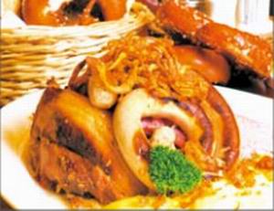 什锦肉盘:著名的凯宾大拼盘,包含纯正德国口味的法兰克福香肠、慕尼黑香肠、熏猪排和煎肉饼等,配上酸菜和芥末,简直就是“肉食”者的极品美味。