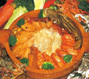 “盆菜”:“盆菜”传统渊远流长,已有数百年的历史,在广东粤菜中占有相当重要的地位,是一种杂烩菜式,其以荤素搭配有致、色味俱佳、营养丰富而深受香港及广东东南沿海人们的喜爱。盆菜的食物会按一定的次序一层叠一层地由上至下排好。上层会放些较名贵和需要先吃的食物,最下层则放些容易吸收汁液的材料,吃盆菜的时候,会由上至下逐层逐层吃下去。