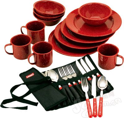 有搪瓷杯、碗、碟、不锈钢刀、叉、勺。另有布夹单独包捆刀、叉、勺,紧凑轻巧。