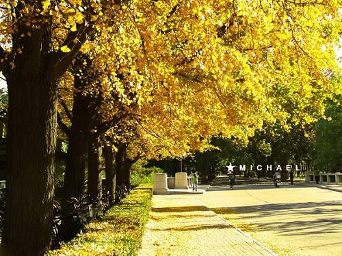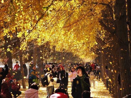 男女老少齐欢乐 最平民的银杏 秋天就那么肆意在窗外,也无需刻意花费身上的银两去欣赏秋天,我们就从最平民的街道里感受秋天,感受金黄色带给我们平凡的快乐。 观看地点:钓鱼台国宾馆门前银杏大道 这里大大小小近千棵银杏都变黄的时候,走在银杏林里,眼前一片金黄。银杏树下的芳草地已被厚厚的金色的银杏树叶覆盖,大家不约而同地把它当做摄影的背景。而人们走上去的时候,踩着金黄的落叶铺成的地毯,感觉很美,踩起来“沙沙”作响的声音,一下子也把人们带回到游戏的童年。那个时节,赏秋的客人、浪漫的情侣,举着长镜头的“拍客”,支起画板的 “画客”,都成为林中一景。 提示:钓鱼台国宾馆东墙外迎宾路没有停车的地方,只有在甘家口或三里河停车步行或骑自行车前往。就餐也在这两处有。 建议:10月中下旬时树叶全黄,不过很可能一场秋风,就叶落归根了。银杏树有围栏,林区中段有一小门可进入,不要擅自翻越带尖的围栏。同时注意爱护林中草木 。不要乱扔垃圾。