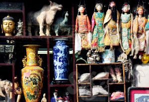 琉璃厂文化街上的店铺橱窗里挂满了传统工艺品。
