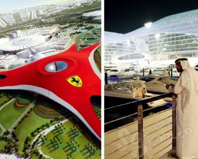 来到阿布扎比,绝对不能错过2010年最新开业的法拉利 (Ferrari) 主题乐园,它是全球最大的室内主题乐园,耗资40亿美元,从空中俯瞰最容易感受到它的大手笔。单是超前卫的红色三叉几何造型屋顶,总长就达2.2公里,屋顶上还有巨大的Ferrari厂徽,直径有6米。若从地面算起,这个红色屋顶有48米高,涵盖了6万平方米的面积。
