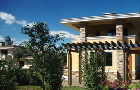 营造新古典主义风格的官邸式建筑,安详而尊贵,厚重而有历史感的铜制门,高雅的灰色、浅米色德国石材外墙,深色坡屋顶,符合几千年来人类对经典建筑的审美情趣,是人们由衷赞叹的建筑。基于对古典建筑的继承和发展。新古典主义建筑创造了一种与现代主义建筑不同的人性化空间,追求精致、完美,创造适于人居住、生活、娱乐的场所,其建筑立面是在标准的古典形式上做一定的改良,装饰适当,所有细节极其得体而精致。