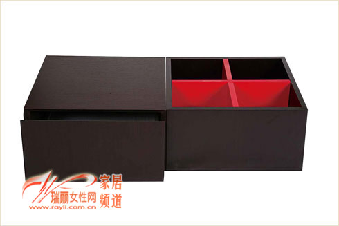 这是一款可以组合的边几,可将两个方形茶几分开摆放也可一起使用,红黑两种色彩为茶几增添了艺术效果,而且抽屉的设计也很巧妙。4448元/个 490×490×255 欧罗巴