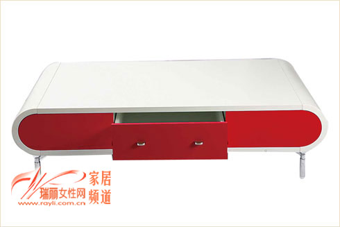 椭圆形的红白色彩搭配的茶几,造型简单而且现代,侧面配有红色抽屉,正面为椭圆形,不宜磕碰,金属腿更增加了茶几的承重性能。1554元 1400×700×38 皇朝