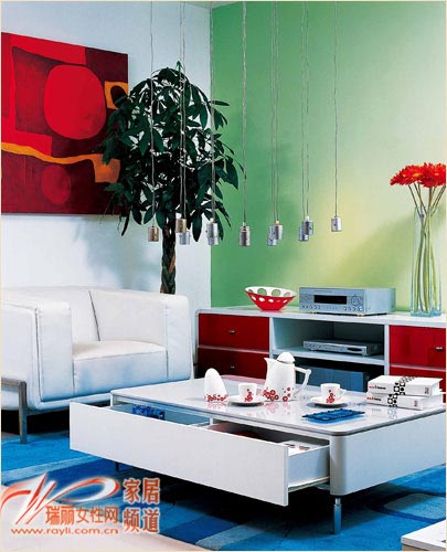 双层茶几是最简便的收纳型茶几,虽然设计简单,但可以解决许多休闲区的收纳问题。这样的茶几除了可以摆放茶具、果盘和烟缸等沙发区必备的小物品,还可以在下层将常用的小杂物、零食或书报收纳起来,既保持沙发区茶几面的整洁,也方便每个家庭成员和来访客人的使用需要。