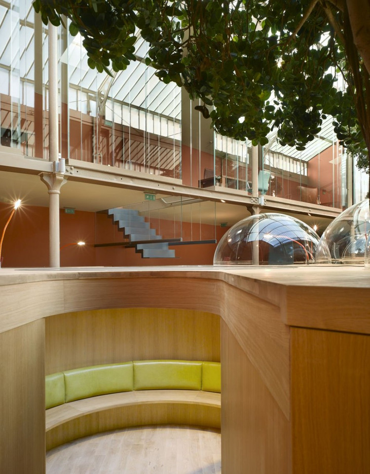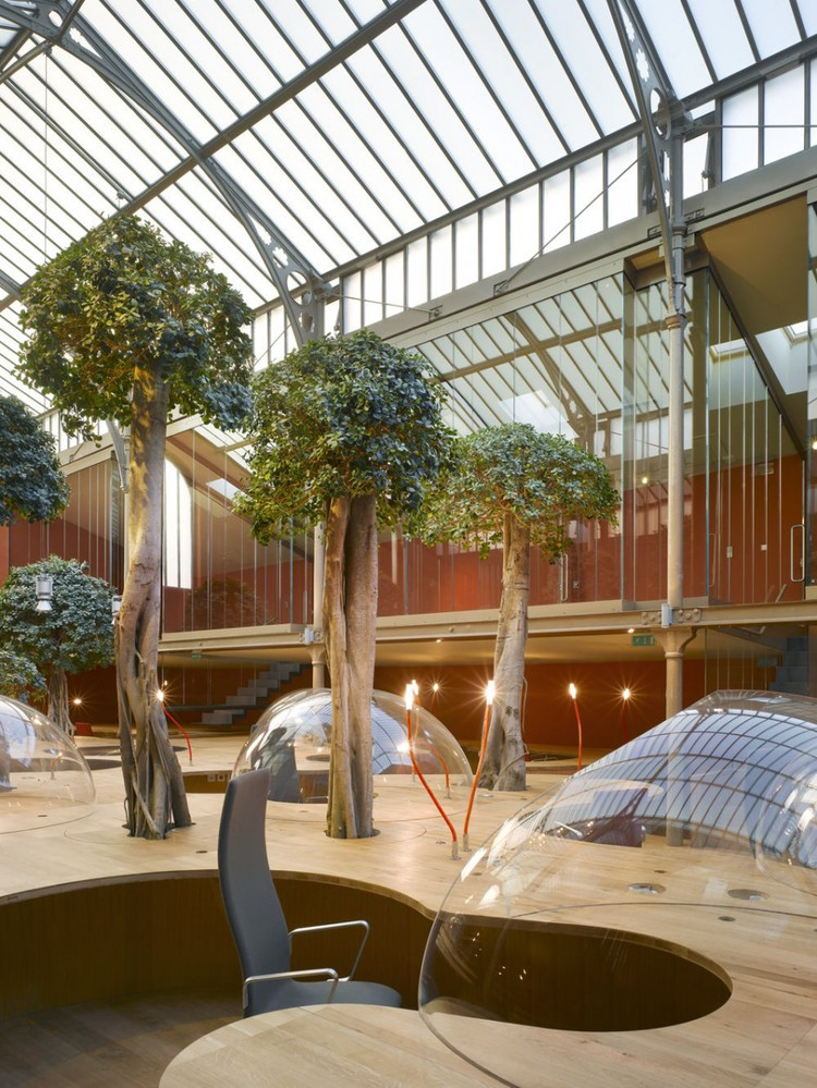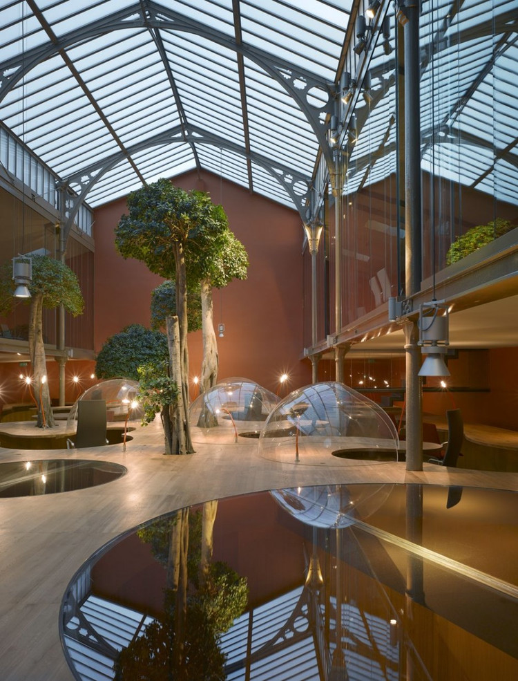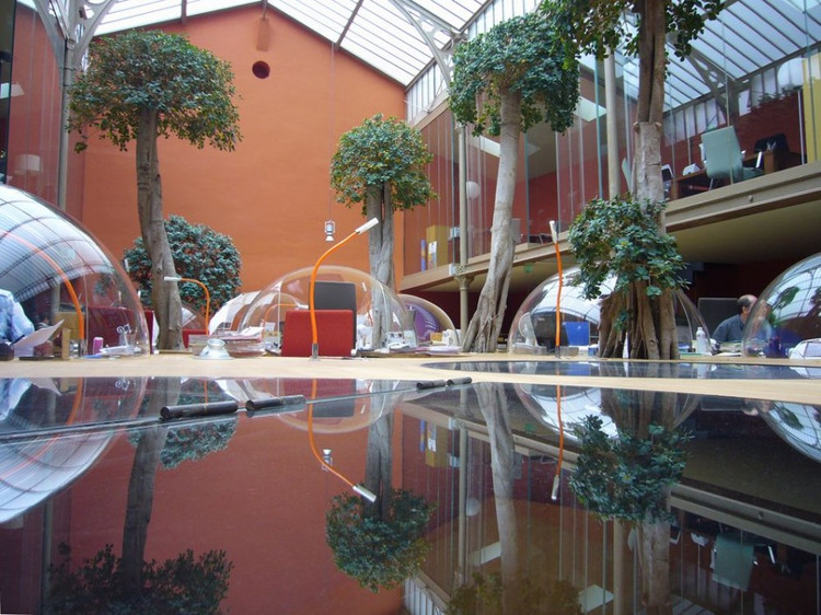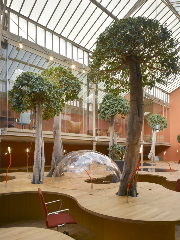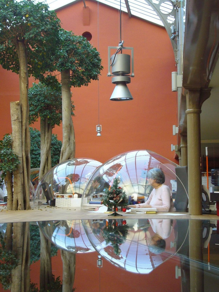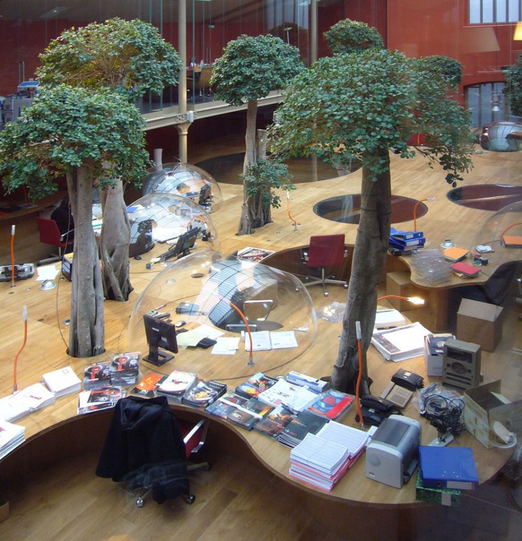 Pons+Huot的办公室,是由法国Pottgiesser设计完成。在偌大的一个空间里有大株的植物存在本身就有一些超现实味道,何况每个人的都有自己一个半圆玻璃罩的”私密”环境,又多了些许外空之类的感觉,给人很深的印象。