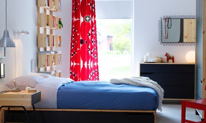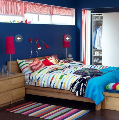 红色与蓝色是一对对比色,在使用时,不宜大面积同时使用,小面积或拉大比例后,同时使用效果最好。未避免对比色的强烈的效果,适合与木色、白色、黑色的墙面或家具同时使用。