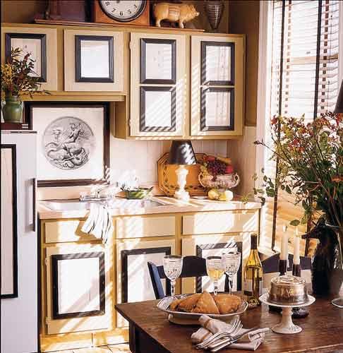 家里不中意的橱柜门板就用这招掩饰。将有关植物的图片、家庭照、旧书旧日历上的图片裁下装裱,相框的大小要以橱柜门为准。在门板上和相框上钻好洞,再用螺丝固定住。如果不想要了,可以把相框拆下,用灰泥把洞填住,补上同样颜色的油漆。