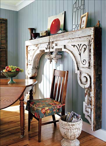 平淡无奇的墙面可以创造出亮点。如果你家没有壁炉不要紧,旧物改造的悬空精美镂花托架看上去和老式壁炉没有太大区别。你也可以购买老式壁炉架,或者用储存的木板自己做。总之,要确保用锚或L形支架在墙面上固定牢。