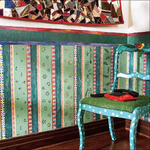 首先,用最浅色的乳胶涂料打底。晾干后,分不同宽度的竖条,漆上颜色,注意每同样宽度的竖条漆一种颜色。最后,用漆笔、模板、小刷子在这些竖条上作画。等完成后,用丙烯酸油漆和薄刷子给自己的作品镶一圈饰边。