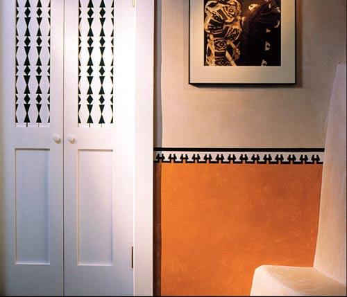 用油漆和模板手绘墙围线。在墙面离地75-90cm处画一条水平线,然后沿着这条线将模板摆好,并用喷胶粘住。用模板专用漆来绘制,如果找不到合适的模板,可用壁纸饰边或剪纸代替。