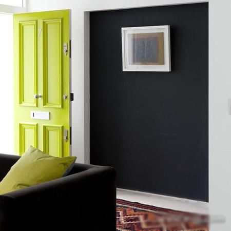 案例二:把门粉刷成高雅的酸橙色,让房间不至于显得那么拥挤~~这个门厅十分的适合搭配现代起居室,黑色的墙壁和沙发时尚非凡。地上的古典风格的地毯,配上这些现代元素的家具,风格更加的耐人寻味~~