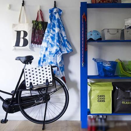案例三:这是一个色彩缤纷的门厅,时尚简洁的储物架使这里的色彩一下子明亮起来,而且让这里有更多的存储空间~~放置些小储物盒可以分类收纳物件,墙上的挂钩能够挂些包包和外套,都是十分实用的~~