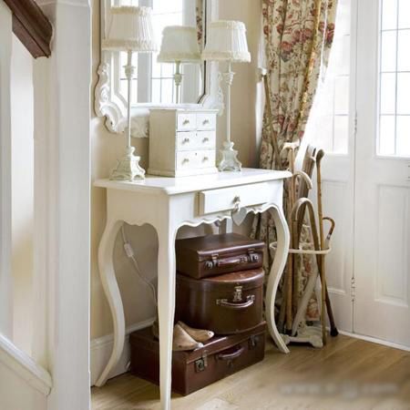 案例七:大厅的入口若是摆上这样有趣的老式的设计,将是一大创新~~苗条的桌案是理想存放钥匙等出门必备物品的好地方,桌下的空间也可以放些储物盒来放置些物品~~桌上华丽的镜子又给人带来一种全新的感受~~