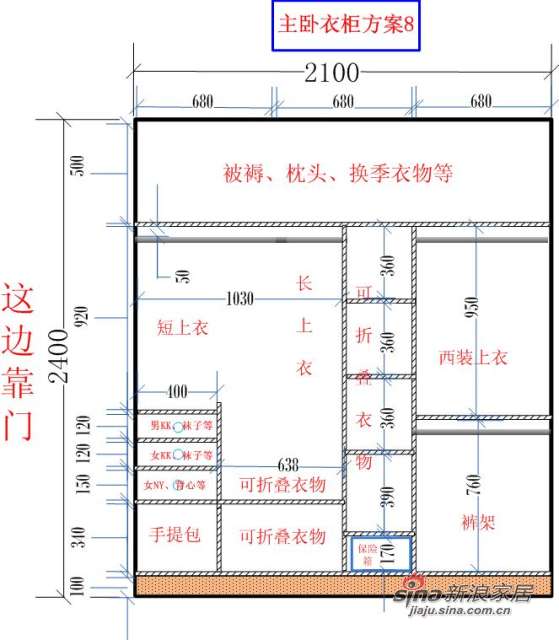 设计衣柜首先要想到自己有哪些东西是要放进衣柜的。像偶就打算把我平常随处乱丢无处安身的包包也收进衣柜里面,所以我就在衣柜里专门留了一个地方放包包的。还有,最终方案里还留了一个放保险箱的位子。本来是没想留的,不过装修不久的朋友建议我们还是得装一个保险箱(保险箱到时是钉紧在衣柜里面,拿不出来的),否则日后一些重要的证件或贵重的物品就会没处放了。虽然偶没啥贵重滴东东可放,可万一偶日后中了彩票捏~ 嘻嘻,所以想想觉得有道理,也就留了一处地方搁保险箱。而且主卧的衣柜偶也遵循了年轻人挂的衣服比较多的特点,留了很多挂衣服的空间。