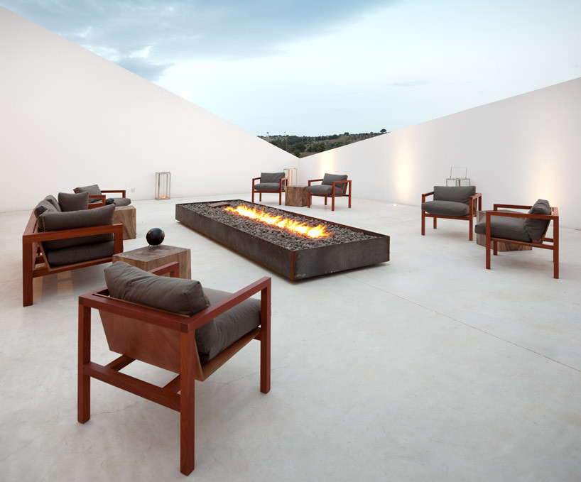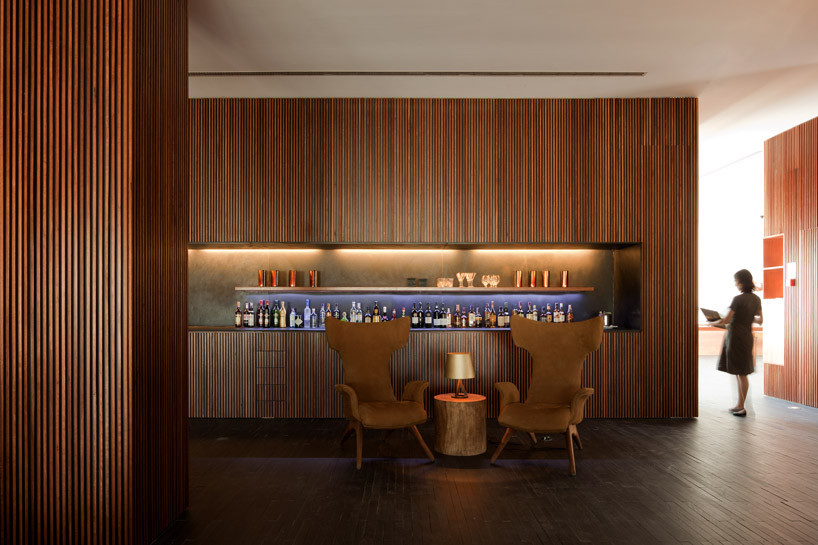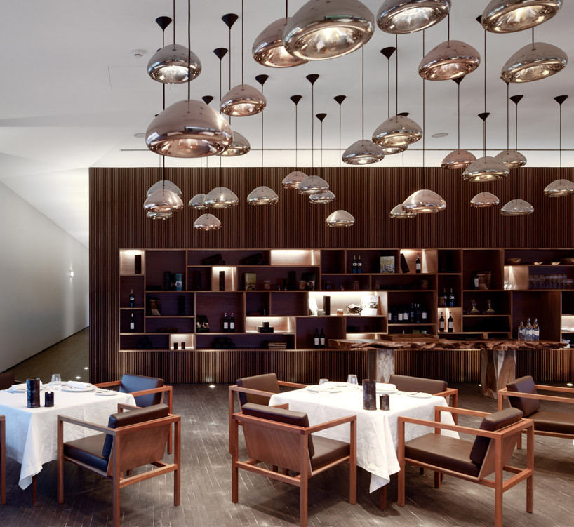 “ L'和葡萄园和度假胜地 “montemor 工作室MK27巴西设有一个感性的室内设计由葡萄牙实践promontorio。包含一个酿酒厂和所有相关的功能,单独的房间,住所,水疗中心,套房和餐厅,拥有一个优雅的石,钢材,木材和功能由几个工匠制作的家具,包括一室MK27。该度假胜地享受的土色调,深浅不一的棕色和黑色,代表一系列的天然木质纹理。墙的垂直细长的木条创建一个纹理,发挥柔软的地毯上,对比与黑色的彩色木地板的坚实的刚性斑片状的色调。抛光铜的球体悬挂在天花板上的灯光在不同的高度,暗指的葡萄酒酿造设备工业方面。块坚实的树干边桌无处不在,从内部空间,外部客房埋到地面,天空开放。是装在钢框架的壁炉的火焰从一张床的岩石暗。