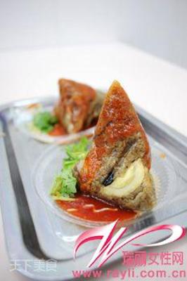 第二、精工作,炒糯米时要拌上卤汤、五香粉、酱色糖乌等配料,要炒得干松,栗子要生剥现用。包扎粽子时,粽叶松紧度掌握好,粽角不能有空隙,锅里开水滚沸,生粽才能下锅;