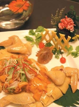 创作窍门:选用家养的土鸡,采用传统的方法制作盐焗鸡,使鸡深入味,手撕成丝捞炒香的鱼翅,配上芜茜、银芽、土芹等,再加入沙姜油。此菜与众不同,风味手法独特,色香味具全。