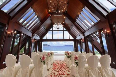 座落在三亚亚龙湾万豪度假酒店的婚礼堂饱览一望无际的湛蓝海景,木质结构的尖顶式建筑在大海、沙滩和椰树的映衬下更增添神圣般的梦幻色彩。整个婚礼堂采用落地玻璃窗,新人们将在碧海蓝天的怀抱下交换戒指、许下珍爱彼此一生的爱情诺言。与婚礼堂连接在一起的还有一片非常私密的连理枝,由茂盛的菩提树自然交结而成,适合举办50人左右的鸡尾酒会和宴会。