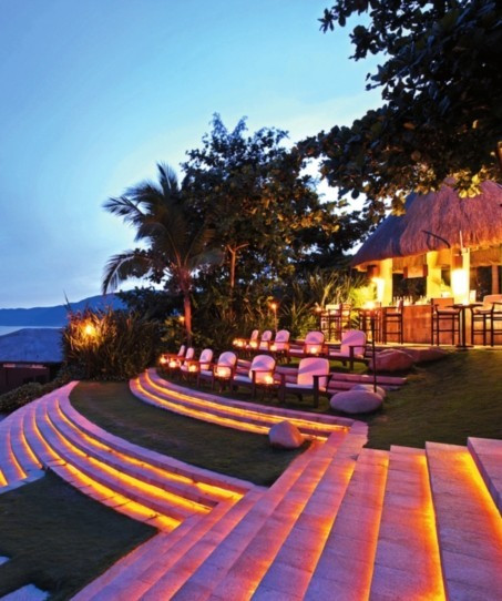 那处“蓝涛沙滩吧”令人印象很深,它是依着沙滩边的土坡走势巧妙设计的,30多级长条石板台阶,露天约可摆放20至60个座位,若临近傍晚,台阶内嵌式灯光映射出的鹅黄光影,交织在新人的爱意中,别有一番韵味。边上,就是搭着茅草帐篷的小酒屋,为观摩新人婚礼的亲朋嘉宾提供清凉的饮品。