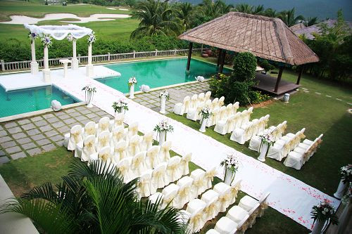在泳池上搭建婚礼舞台?没问题。喜欢这类个性化需求的新人,建议选择登巴萨别墅,它位于酒店别墅区深处,总占地1740平方米,面朝高尔夫球场,视野开阔,独有的巴厘岛风情别墅,与草坪、泳池、宴会厅、婚房、草亭等搭配,加上酒店独创的“中式管家”和保姆服务,温情无处不在,创意与甜蜜共存。