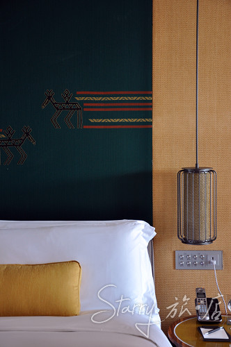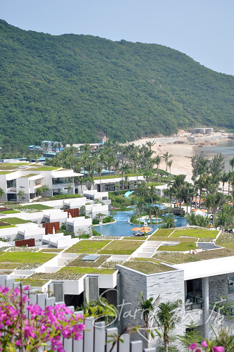 吃饱喝足玩够睡醒,第二天有足够的精神细细看看酒店,发现这家洲际的风格还真是讨人喜欢。它的各处空间都很开阔及开放,让处于室内或半室内的人和外部有足够的接触面,时刻记得走出50步就能跳进大海。海南岛的本土元素在客房内外有巧妙地体现,例如门牌号的字体模仿黎族传统织锦样式,并配有鹿之类的动物纹样。房间内则用船桨、器具等进行装饰,床旗和床头壁挂都是黎族织锦,图案简洁,配色典雅。屋顶花园的想法我最为赞赏,酒店内所有建筑的屋顶都有绿色植被,从高处看下去,一片绿意清凉,若是住在屋里,这种天然隔热层也比空调之类要舒适得多。