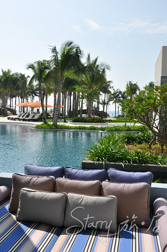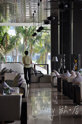 很好的季节。传说中的台风丝毫不见踪影,温度让人微微有汗又不至于湿粘,空气凉爽干净,我们这些从北方大风中逃窜到此的人纷纷大赞三亚的好天气。站在半山半岛洲际度假酒店的大堂里,能感觉到海风一路晃晃悠悠从那一头吹到这一头,吹得人神清气爽。把大堂和Lounge设计成这样长而阔的样式,怕就是为了不浪费一丝一毫海的气息吧。