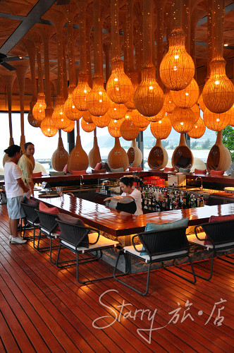 放好行李后的第一件事自然是去看海。从阳台上看,此处山海环抱,正好处于弧形凹处,远望东海苍茫一片,能见着些零星的船影。天色暗了,但我还是忍不住下去跑到海边,在栈桥上好好吹了一会海风。一回头,沙滩吧的藤编泡泡灯已经亮了,有点像星光,不过色调更温暖。有人从泡泡吊椅里探出头来招呼我过去,音乐和鸡尾酒,不着边际的闲聊,哎,沙滩之夜真是美妙。