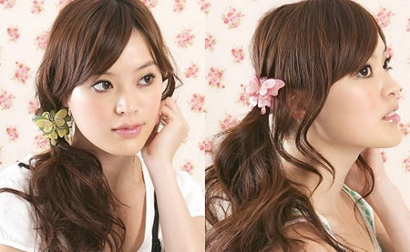将马尾放低,斜斜得垂下,再配以色彩艳丽的蝴蝶发饰,点缀出浓浓春日里的柔美小女人气质。