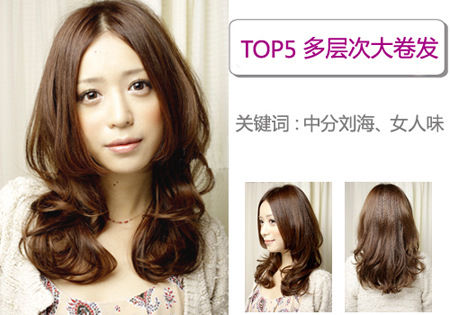 小编点评:中分的刘海给人非常成熟的感觉,如果你不想成熟到有点老气的地步,那么这款搭配大波浪卷度和层次剪裁的中分发就很适合你。高层次的内包发尾能够掩饰肉肉的脸颊,低层次的大卷让发型更具动感,消除了过分成熟的感觉。