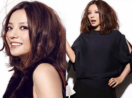 赵薇脸型有些短,而中分发型有拉长脸型的效果,这样看脸型就很完美。梨花头当然是时下潮流。中长发不显得拖沓,发型很有活力!