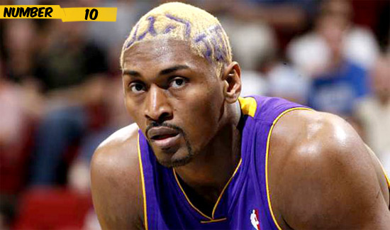 罗恩.阿泰斯特,洛杉矶湖人队的前锋,如某些其他球员一样,也将头发染成了金色。只是人们不知道,当他看到这糟糕的结果时,为何不将头发干脆剃光。