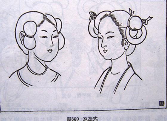 双挂式之梳编法,是将发顶平分两大股,梳结成对称的髻或环,相对垂挂于两侧。这种发式多用于宫廷侍女、丫环侍婢或未成年之少女。据记载从秦开始,延续及近代,其中最典型的是双丫髻及双挂髻,这种发式在存世的古画中特别多见。敦煌千佛洞供养人之侍女与阎立本〈列帝图〉之宫侍,皆类似这种发式。其变化一般有“双丫髻”、“垂挂髻”、“双平髻”等