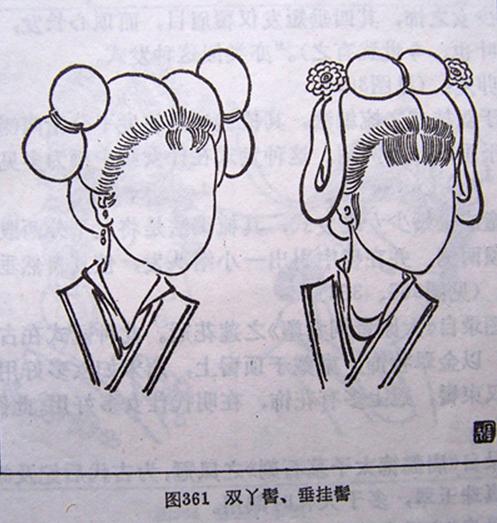 发为儿童或未婚少女之发式,其梳编法是将发平分两股,对称系结成两大椎,分置于头顶两侧,并在髻中引出一小绺头发。使其自然垂下